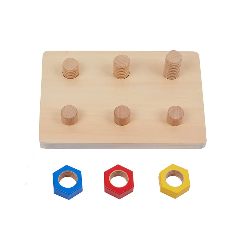 This plate has three pins where nuts in different colors and sizes can be turned around.
