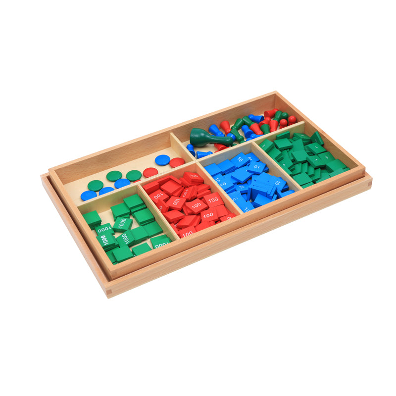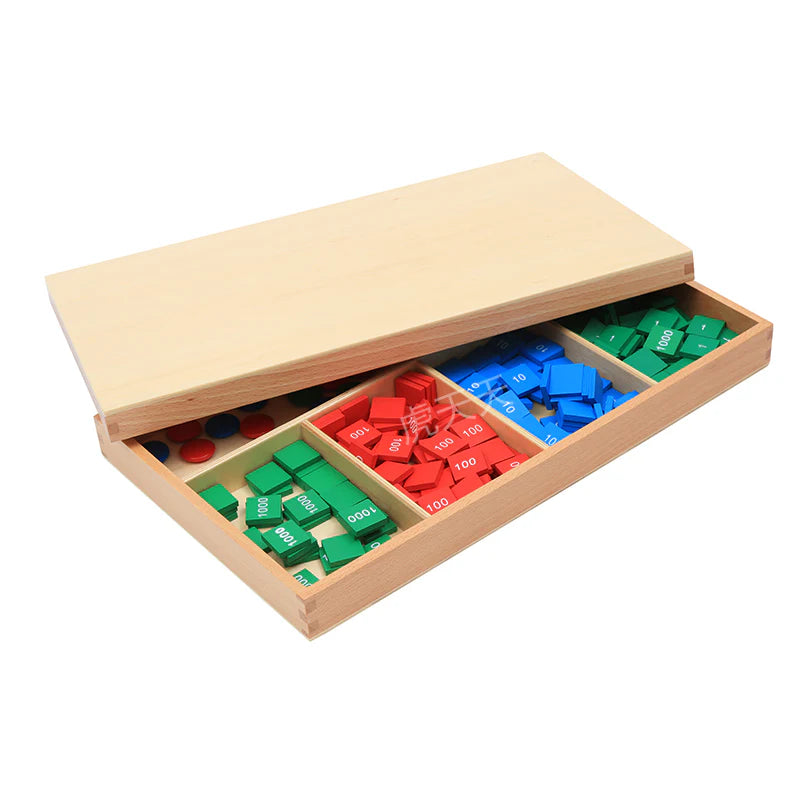 Wooden box with six compartments containing green, blue and red wood tiles labelled with 1, 10, 100 and 1000 and wooden skittles and counters.