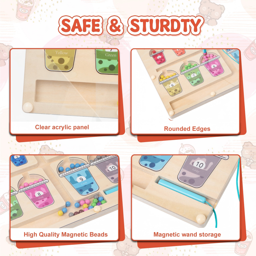 The magnetic toddler game features 55 magnetic beads in 10 distinct colors, with “cup” representing numbers 1-10.