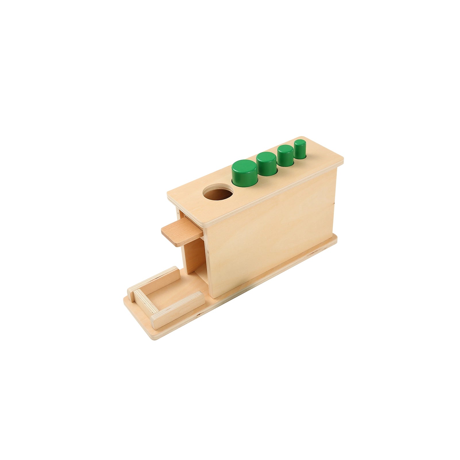 This is a Montessori cylinder drop box. Children drop cylinders into matching holes, helping develop hand-eye coordination, problem-solving, and fine motor skills