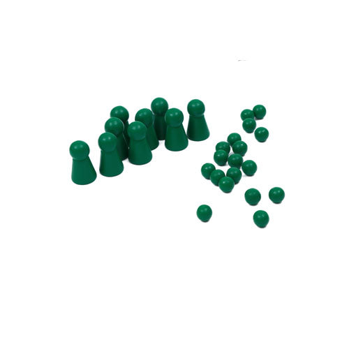 Wooden division board with 100 green beads and 10 green skittles in a wooden box. Using the Divisions Board, the child practices the tables of division with the dividends 1-81 and divisors 1-9