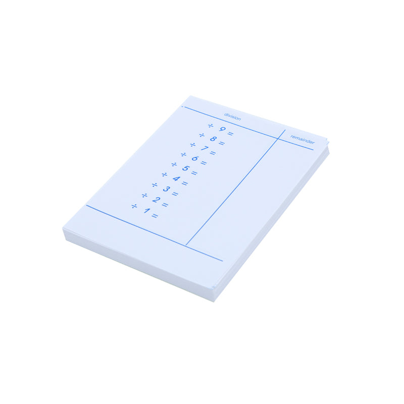 100 sheets of division tables for the numbers 1-81 for use with the Division Bead Board.