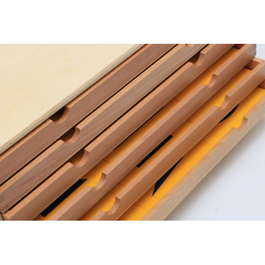 The geometric cabinet with 6 drawers containing 36 geometric insets and frames: 6 circles, 6 rectangles, 7 triangles, 6 regular polygons, 3 curvilinear figures, 6 quadrilaterals.