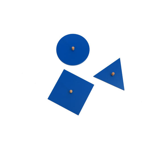 Note This item can be used in conjunction with A104 Cards For Geometric Demonstration Tray. Materials Wooden tray containing six wooden squares, three of which have insets: the triangle, the square, and the circle. These insets are painted blue in contrast to the natural wood finish of squares. The geometric figures contain a small knob in the center to remove the figures from the tray. Presentation 1 Invite the child to work with thegeometry demonstration tray. 2 Show the child where the geometry demonstration tray is located on the shelf. 3 Indicate procedure for carrying the material: a hand on each side of the tray, thumbs on top, fingers underneath. 4 Place the tray on a table or rug. 5 Say, ""After I remove the insets, I will match each inset to it‘s frame."" 6 Remove each figure, indicating to the child how each knob is to be held between the thumb, index, and middle fingers of the dominant hand. 7 As each figure is removed, beginning at the left and proceeding to the right, place the figures in order in front of the tray. 8 With the dominant hand, grasp the figure to the left by the knob. With index and middle fingers of the subdominant hand, moving clockwise, trace the edge of the figure. Select the frame in the demonstration tray that matches. Trace the frame and insert the inset. Continue until all figures have been replaced into their proper frames. 9 Return the material to the shelf in the manner indicated in step #3. Note: Square, circle, and triangle is the sequence of figures in the demonstration tray. Control Of Error Each inset will properly fit only in it’s proper frame. Points Of Interest Some figures turn in their inset when rotated, some do not. Some figures can nest in the frames of other figures. Purpose Development of visual discrimination of shape. Development of concentration, coordination, and independence. Responds to the sensitive need of order in the child. Preparation for writing. Preparation for geometry. Development of tactile sense. Introduction to plane geometry nomenclature. Variation Mixed Order: Proceed as in Presentation 1 through step #6. Place all three insets on the rug in mixed order. Have the child replace them in proper order. Three Period Lesson: Proceed as in Presentation 1 through step #6. Introduce names of the shapes with the Three Period Lesson. Other Shapes: Introduce all shapes in the geometric cabinet using the demonstration tray and proceeding as in Presentation 1. Select groups of three figures of highest contrast. After the sensorial experience, introduce vocabulary. Main Material Beech/Plywood.