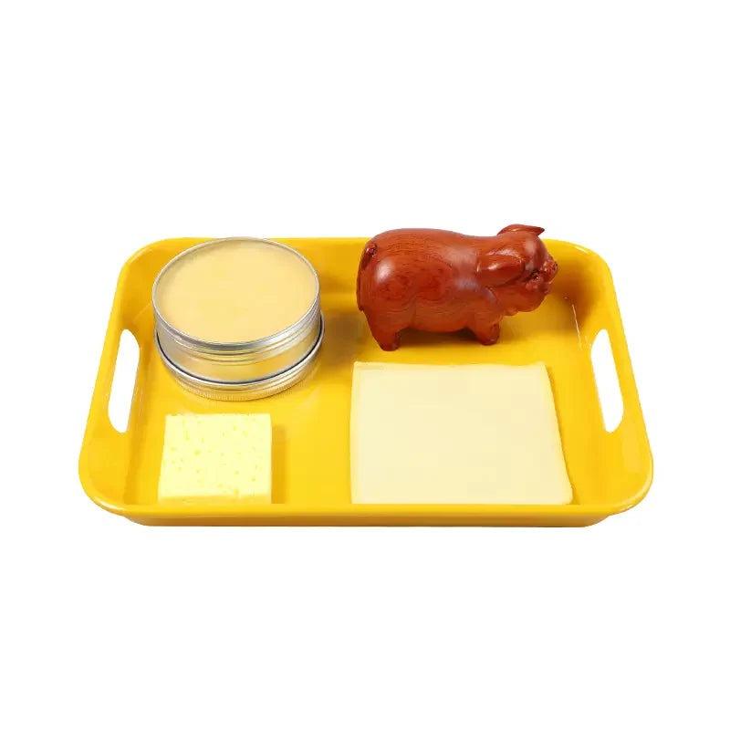 This set included 1 wooden object, a bottle of solid wax, a piece of polishing cloth, and a yellow sponge, all things contained in a plastic yellow tray.