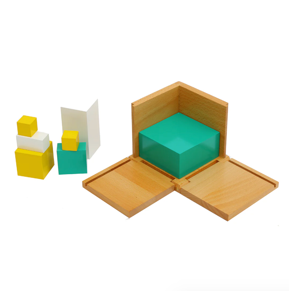 Consist of seven pieces of wood. Two yellow cubes and two rectangular white, two green rectangular, one yellow cube and a cube box constitute.
