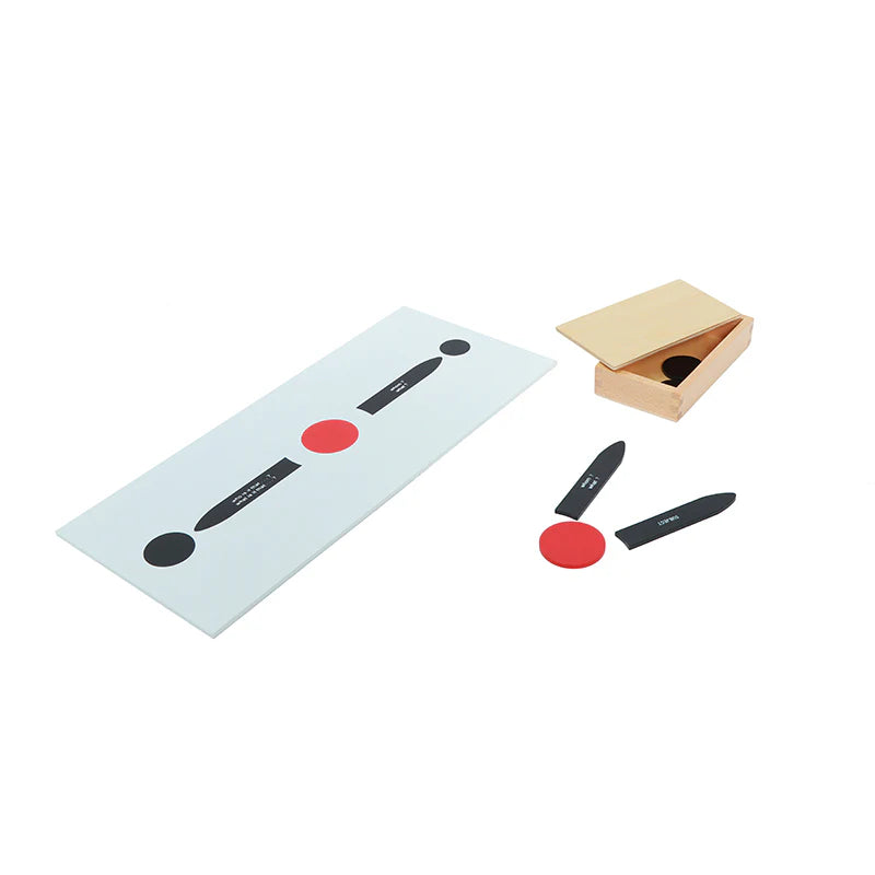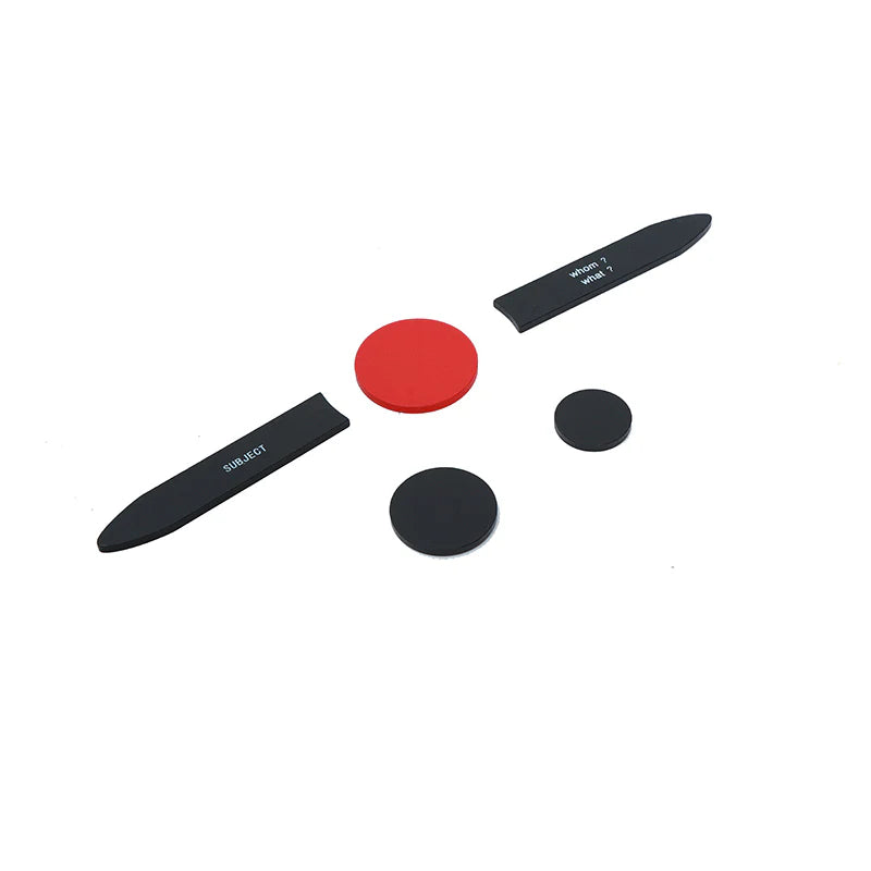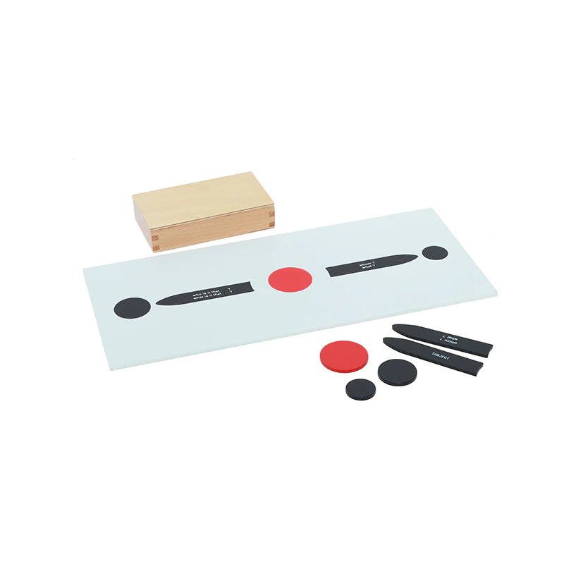 The set includes a chart and a wooden box containing circles and arrows with the printed questions for beginning analysis.