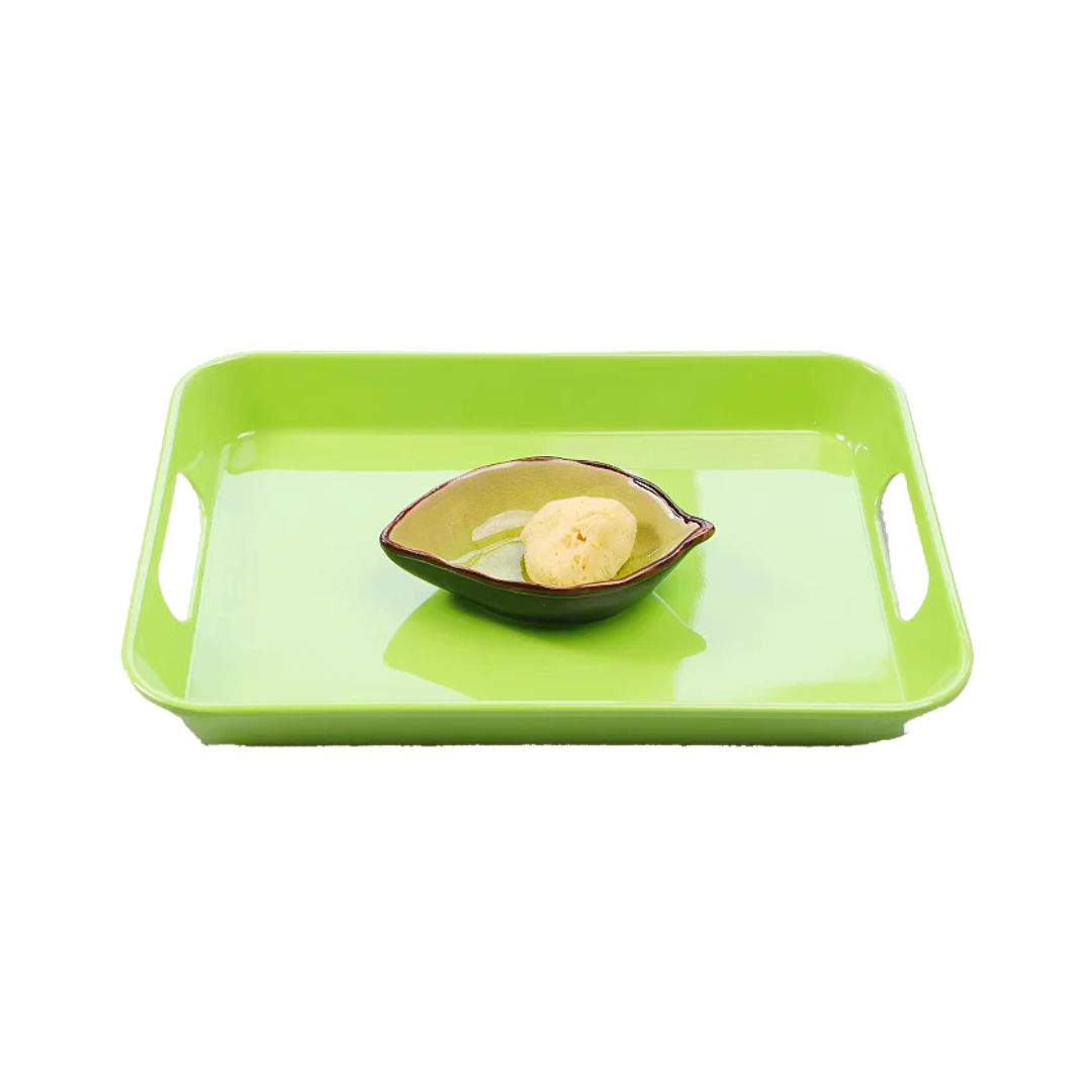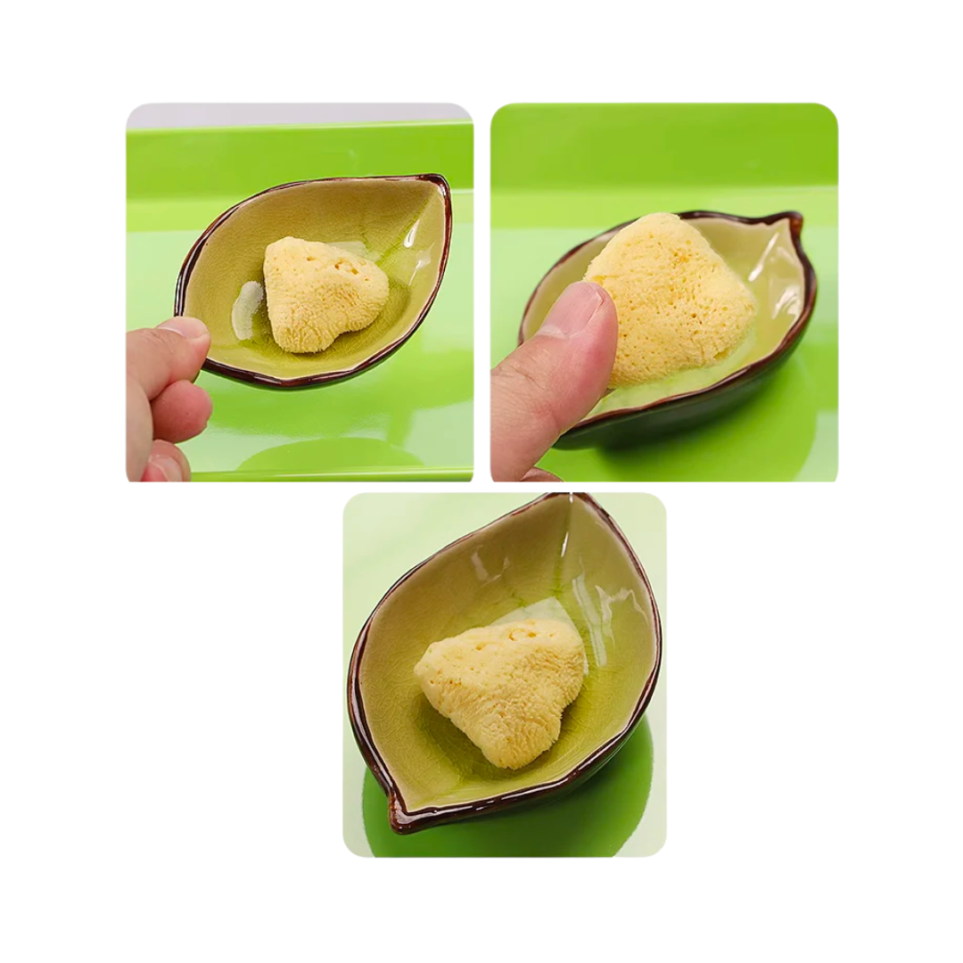 A tray contains a leaf-shaped bowl and a natural sponge.