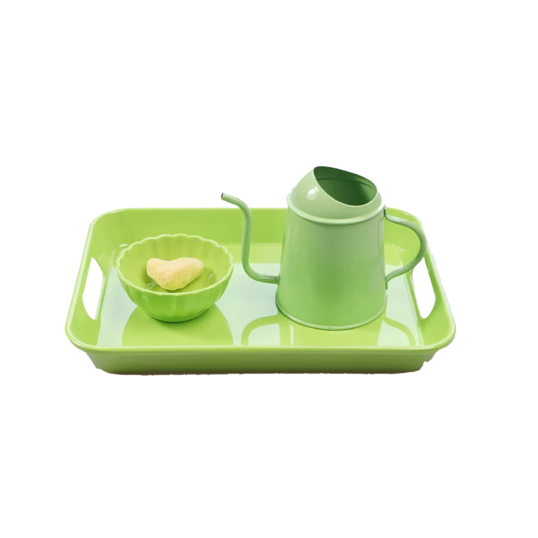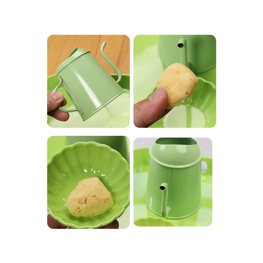 A tray contains a small round bowl and a natural sponge, also a watering can.
